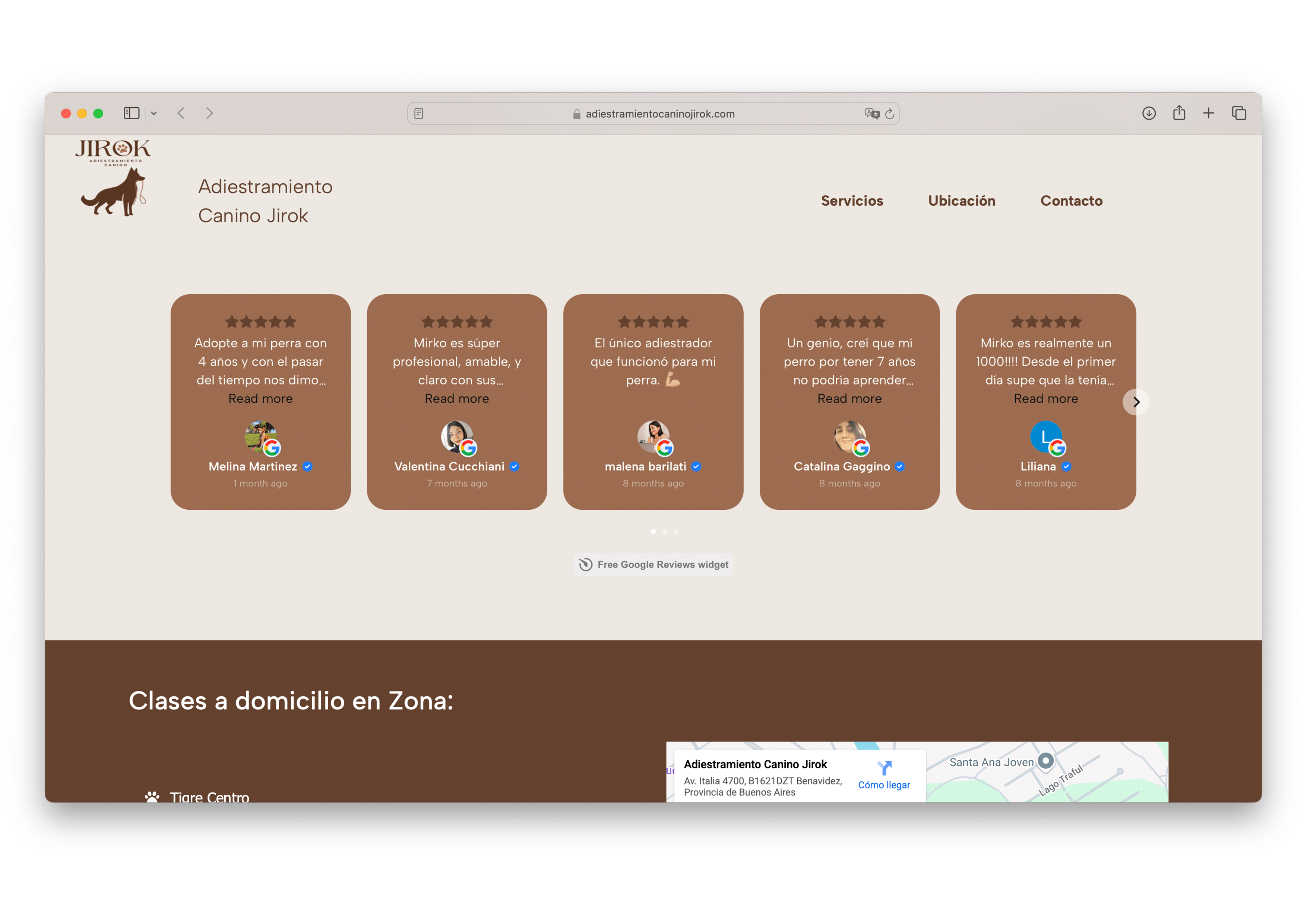 Diseñamos una página institucional para un adiestrador canino. El sitio destaca los servicios ofrecidos, testimonios de clientes y un sistema dinámico para navegar entre las distintas secciones.